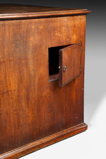But then I found a cellaret in a piece of furniture that a] had nothing to do with food or drink and b] was never placed in a dining room. Examine a George II mahogany pedestal desk (below) that had oak drawer linings and gilt metal mounts - this desk would have sat proudly in the study. Yet the pedestal desk hid two secrets - an unusual cellaret drawer and a side compartment for glasses. The elegance of its design, quality of timber and craftsmanship, and its fine quality gilt metal handles suggest a distinguished London workshop. But what was the owner thinking, having quiet tipples in his study, perhaps with an important guest? And did his wife know?