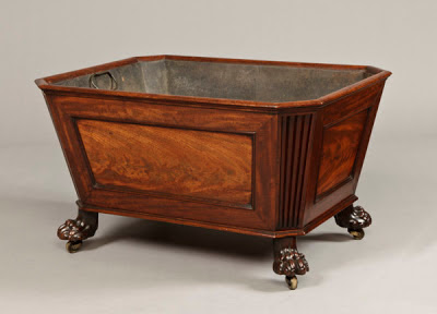 In the later C18th, when the object called a sideboard was transforming into a large and important piece of furniture, the cellaret was merely a detached receptacle. The cellaret was an elegant piece of mahogany furniture, almost always designed in the neo-classicist style, that could be octagonal, circular or oval. The important part was actually inside, lined with zinc partitions to hold the bottles and ice. A tap might be fixed in the lower part for drawing off the water from the melted ice.