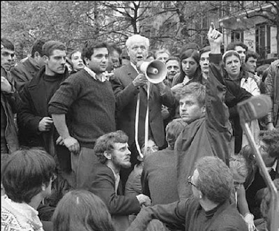 Cohn-Bendit asks for silence, so poet Louis Aragon can talk to students on a megaphone